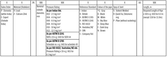Example: PRPA0750061GR00600 - This code represents PVC Pressure Pipe of 75 mm nominal outside diameter having 6.0 Kg/cm² pressure rating as per IS-4985 with Quick Fix™ Elastomeric Ring Joint and of 6m.