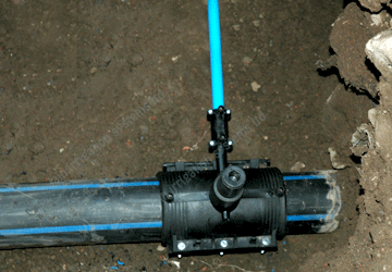 पीवीसी पाईप : पीवीसी वितरण पाईप में टेपिंग की विधि में समान साईज की सेडल जिस साईज का आउटलेट आवयक हो (1/2‘, 3/4‘ या 1‘) पीई होम-लाइन पाईप को सेडल आउटलेट से काम्प्रेशन थ्रेडेड एल्बो की सहायता से कनेक्ट करेगें।