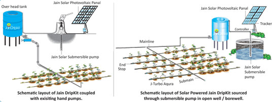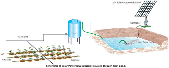 जैन इरिगेशन सिस्टम लि. एक प्रभावी समाधान प्रस्तुत करता है। जैन सोलर पावर ड्रीप इरिगेशन सिस्टम विशेषत: उन कृषकों के लिये निर्मित है जो कि औपचारिक बिजली प्राप्त करने की पहुंच के बाहर है और उनके पास बहुत ही छोटी जोत भूभाग है। सोलर पम्प में, ब्रश रहित डी.सी. मोटर होती है, जिसे फोटो वोल्टेटिक पैनल से पावर प्राप्त होता है। इस प्रणाली में कोई बैटरी नही होती, अत: सोलर पम्प जल्दी शुरू होता है और शामतक लगातार कार्य करता है।